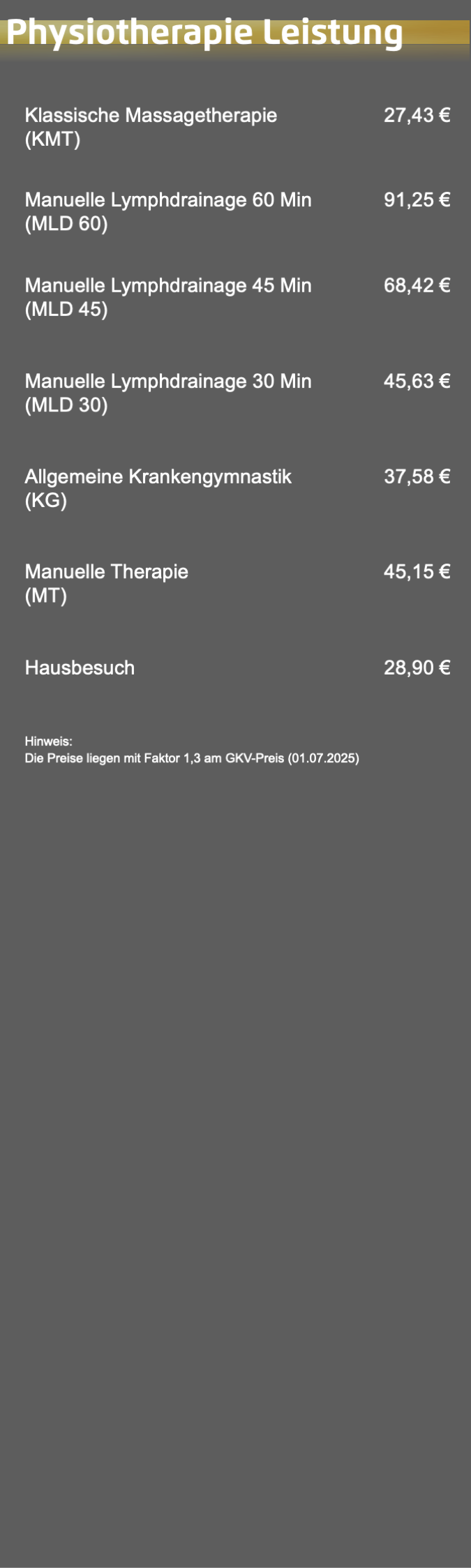 Übersicht unserer Behandlungspreise in der Physiotherapie für Privatversicherte und Selbstzahler:innen